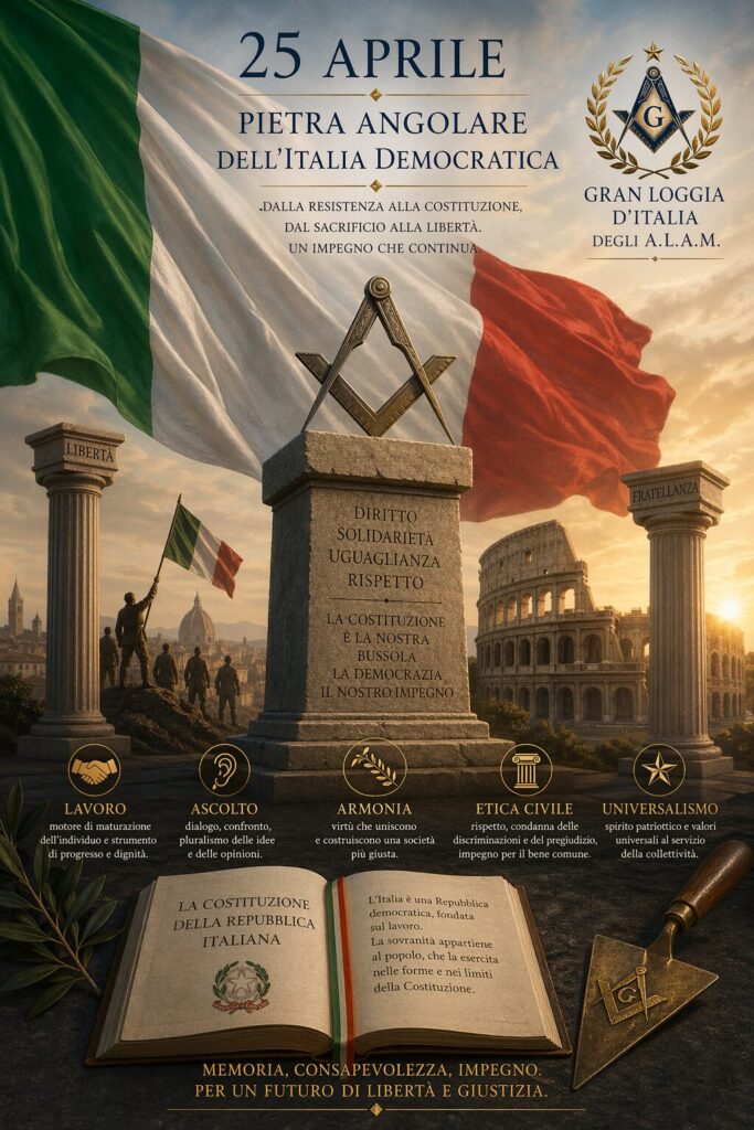 Alla vigilia del Festa della Liberazione, la Gran Loggia d’Italia propone una riflessione che restituisce al 25 Aprile il suo significato più autentico: fondamento della democrazia e patrimonio condiviso. Nel comunicato, il Gran Maestro Luciano Romoli invita a superare le contrapposizioni ideologiche per riscoprire, attraverso memoria e pensiero critico, i valori costituzionali di libertà, uguaglianza e partecipazione, indicati come guida per affrontare le sfide del presente.